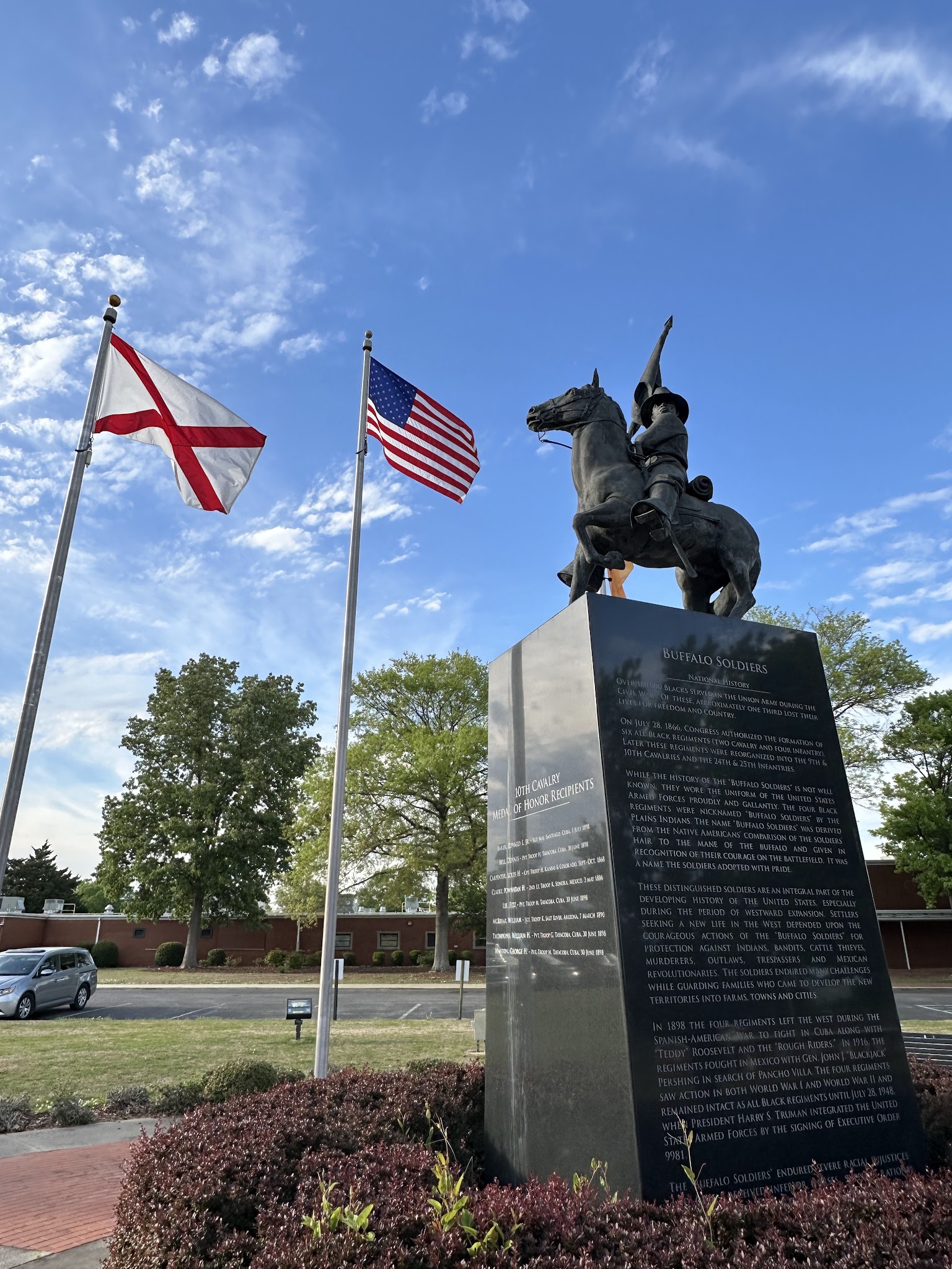 The Buffalo Soldiers Memorial Monument itself was unveiled and dedicated on April 30, 2010, after fourteen years of dedicated work by volunteers and city officials.[2] The centerpiece of this memorial park is a striking bronze statue of Sergeant George Berry, who carried the regimental flag at San Juan Hill, mounted atop his horse and holding the regimental colors. This powerful sculpture rests upon a 10-foot-tall granite base weighing 35,000 pounds, which is inscribed with the history of the Buffalo Soldiers and lists those who received the Congressional Medal of Honor.[2] The memorial was conceived by Dr. John Cashin, whose grandfather wrote a comprehensive history of the Buffalo Soldiers, and was sculpted by Casey Downing, a talented artist from Mobile, Alabama.